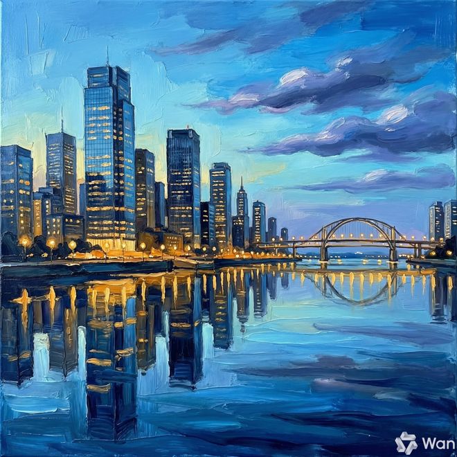一座现代城市的天际线夜景,高楼大厦的灯光倒映在平静的江面上,远处有一座跨江大桥,天空中有几朵流动的云,电影感构图,宽幅画面,油画质感。