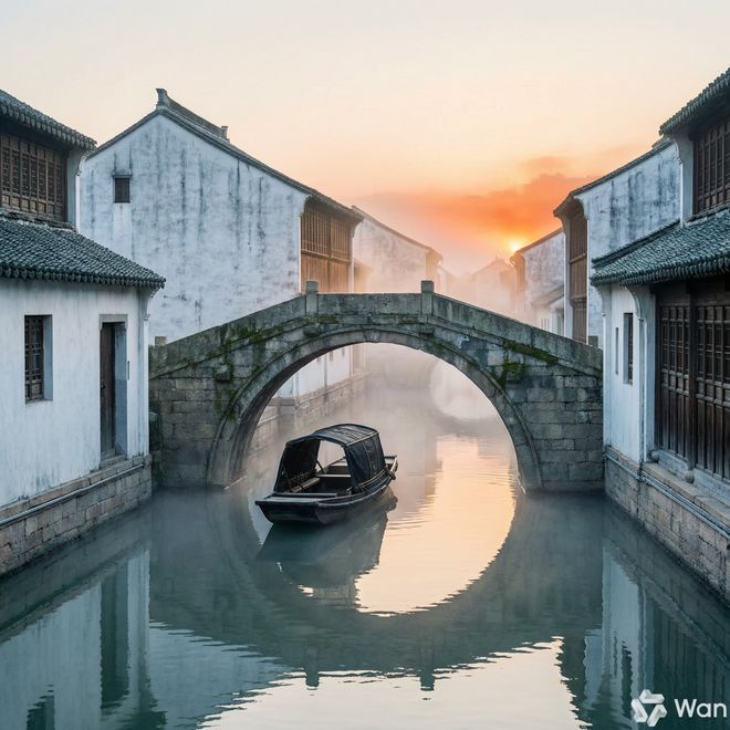一座江南水乡古镇的清晨,石拱桥横跨窄河,两岸是白墙黛瓦的老房子,河面有薄雾弥漫,一条乌篷船静泊在桥下,柔和的晨光从东方透过来,摄影质感,35mm镜头。