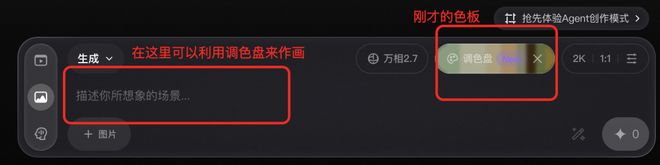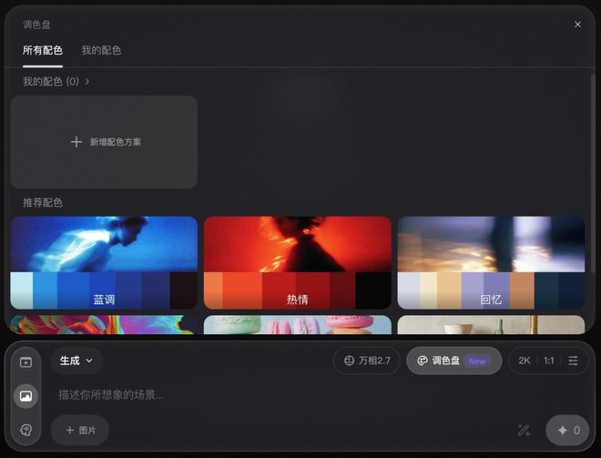 第三步,确认配色后回到主界面,调色盘已经挂载到工具栏上。输入场景描述,点生成,出来的图就严格遵循你定义的色彩方案。