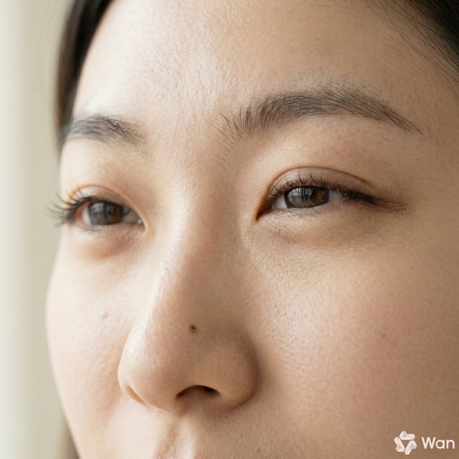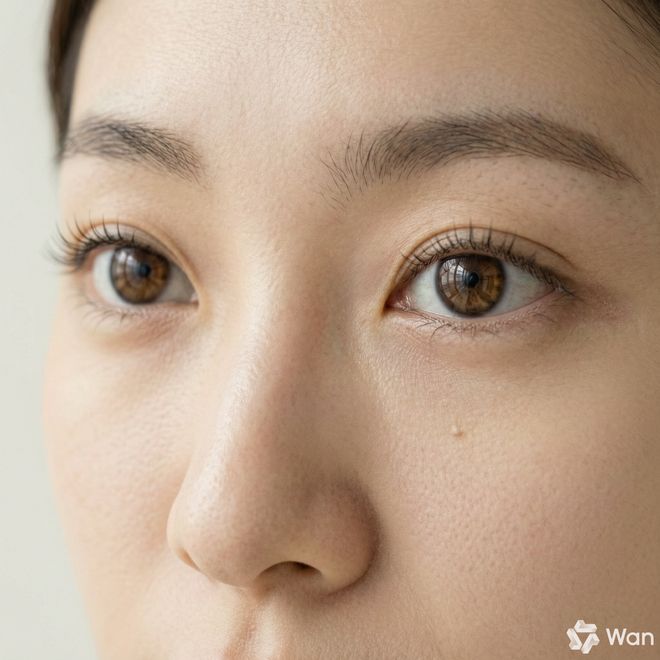 一张超近距离面部特写,画面只截取眉毛到鼻尖的范围,一位25岁东亚女性,【眼睛的设定】,皮肤细腻有毛孔质感,自然光从正面柔和打入,没有妆容,素颜,睫毛根根分明,虹膜深棕色可见纹理,眼角有一颗小痣,背景完全虚化为奶白色,微距摄影风格,100mm微距镜头,超高清。