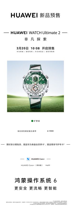 从官方发布的预售海报,以及此前在AWE等展会和赛事中的亮相来看,华为WATCH Ultimate 2非凡探索 旷野绿在外观设计上有着极高的辨识度。其继承了系列的设计精髓,将传统高端腕表艺术与专业户外机能设计巧妙结合。