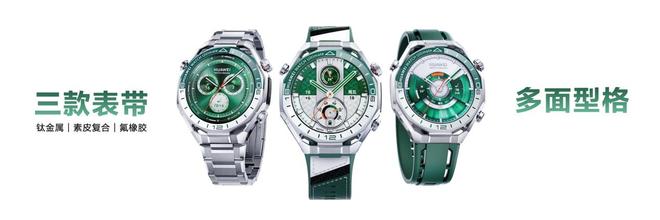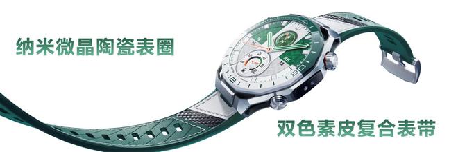 在材质和工艺方面,华为一如既往地展现了旗舰级水准。表壳采用非晶锆合金搭配超硬镀膜,表圈为绿白双色纳米微晶陶瓷,再加上蓝宝石玻璃表镜,不仅外观高级细腻,而且坚固耐用。为了适应训练、比赛和商务等不同场景,腕表还提供了复合素皮和氟胶材质表带,满足多样化的穿搭需求。