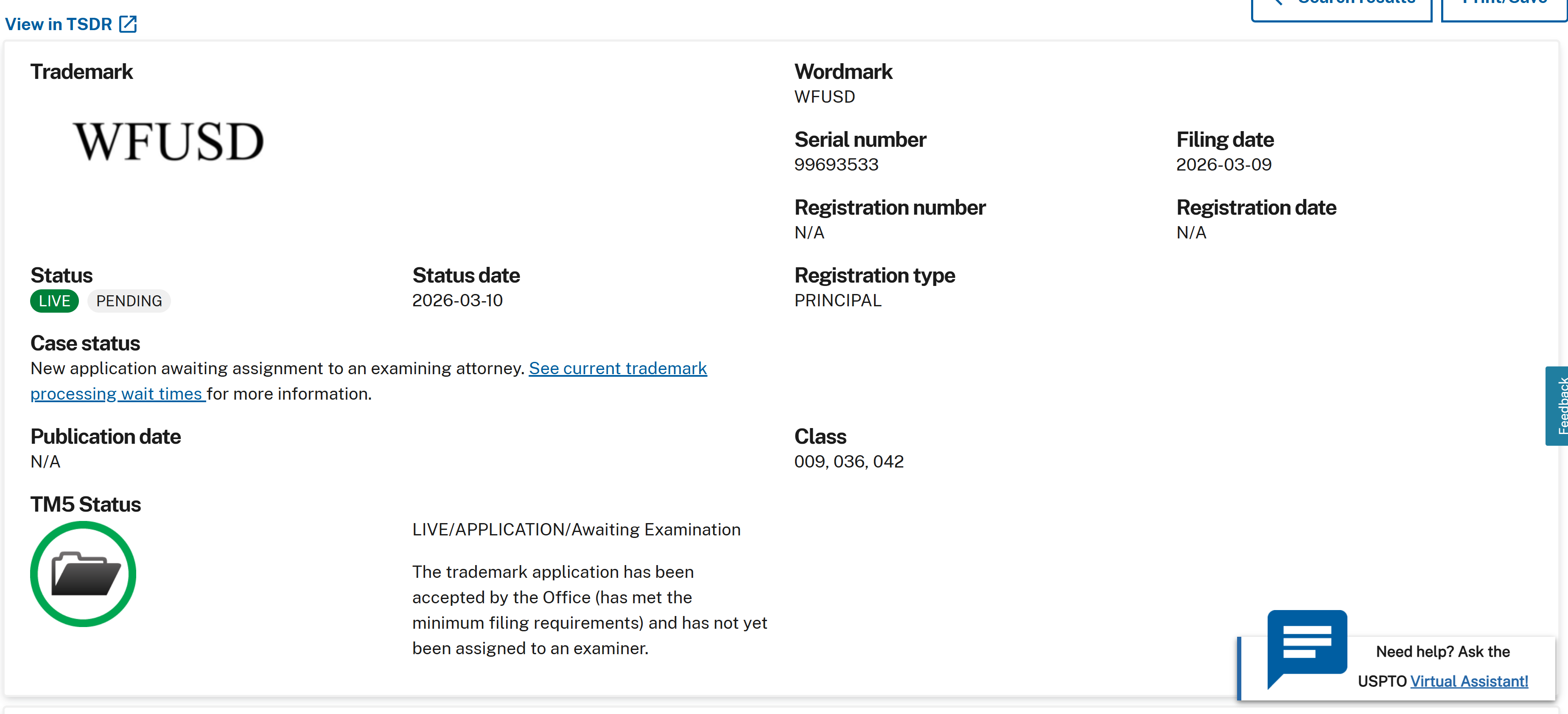 该申请是在周二提出的,并旨在保护名为“WFUSD”的标识符。目前这项申请仍在等待审查阶段。