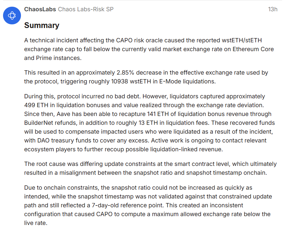 近日,由于配置不当,Aave平台所依赖的风险预言机系统出现了问题,导致约2700万美元的wstETH仓位被平仓。随后,该公司采取了措施来补偿受影响的用户。