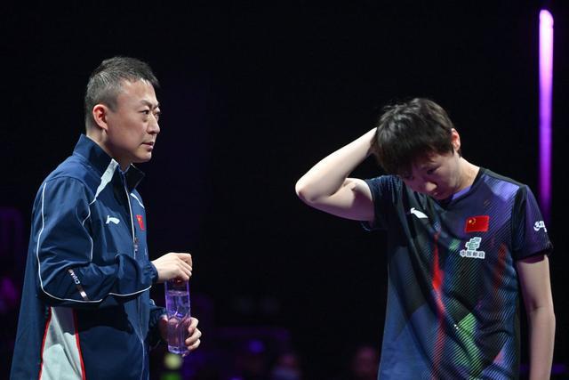 在比赛间歇期间,王曼昱与她的教练马琳进行了短暂交流。