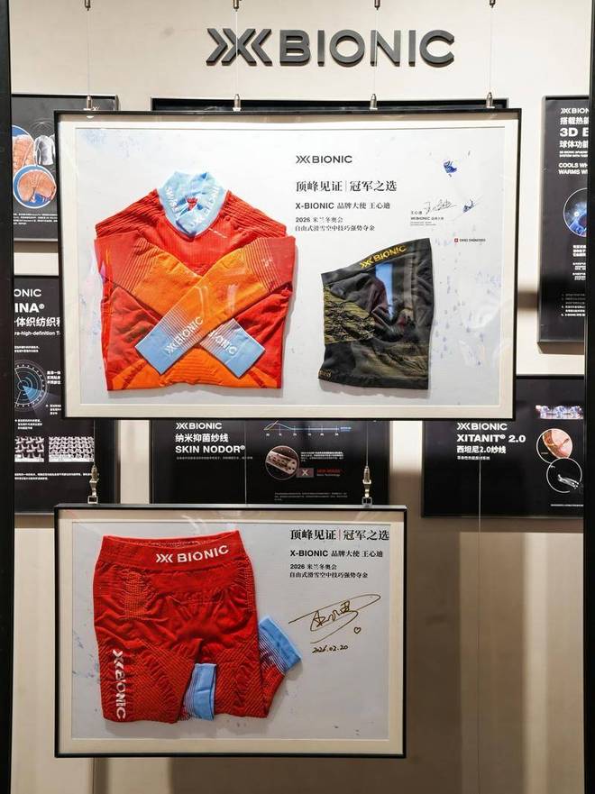 正式签约后的好处是,X-BIONIC可以随时给到王心迪最新推出的专业装备。2025年自由式滑雪世界杯阿拉木图站,他打破三年的世界杯“冠军荒” ,拿下男子空中技巧冠军,当时穿着的就是X-BIONIC最新的红蓝配色聚能加强滑雪功能内衣。这件装备也被他穿到了米兰冬奥赛场。在这次见面会直播现场,他特意将这件“幸运装备”带了过来。