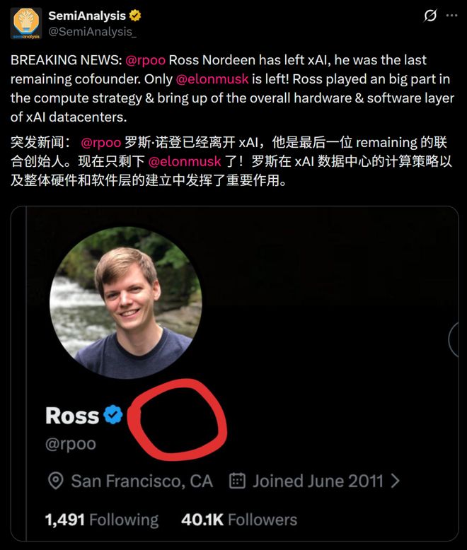 因为Ross Nordeen不是普通员工——他是xAI除马斯克以外,最后一位留守的联合创始人。