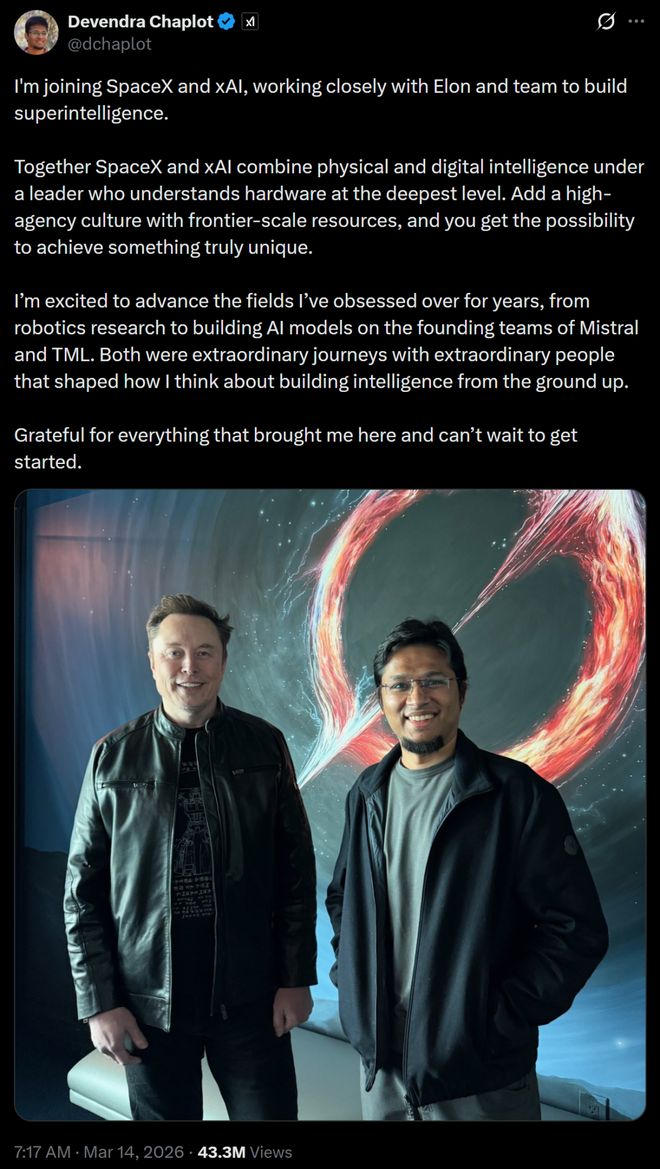 他的离开,意味着一个冰冷的事实:2023年马斯克亲手拉起的xAI创始天团——11位联合创始人——到2026年3月底,全部出清,一个不剩。