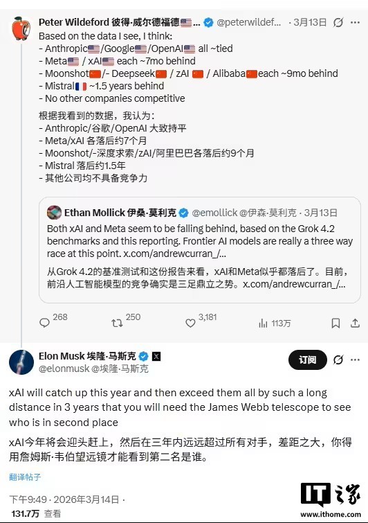 这份于3月14日发布的帖子是对预测师彼得·威尔德福德的评估直接回应。威尔德福德的评估依据各类基准测试和公开报道,对人工智能开发商进行了排名。