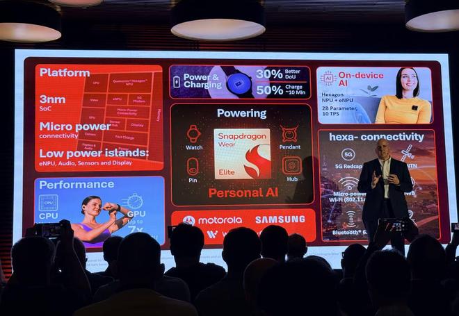 骁龙可穿戴平台至尊版采用3nm工艺制造,并配备了专用的Hexagon NPU与低功耗eNPU双核AI加速架构,支持端侧运行多达20亿参数的大模型。首个token生成时间缩短至0.2秒。