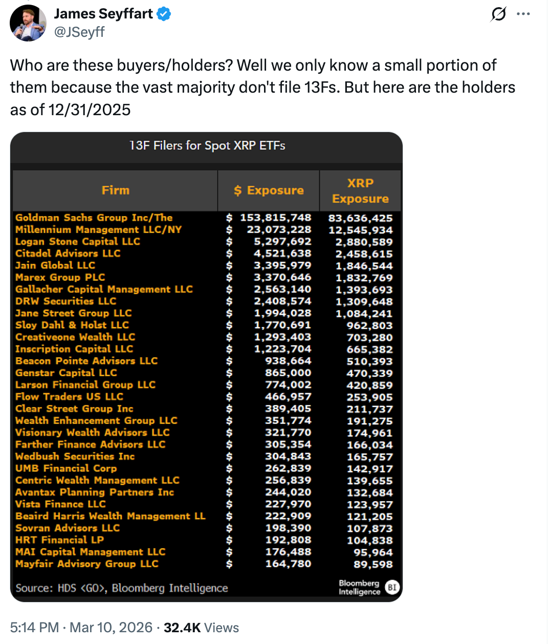 高盛的这一举动并非孤立的。据彭博高级ETF分析师James Seyffart表示,其配置约占前30大机构投资者持有XRP ETF总额2.11亿美元的73%。