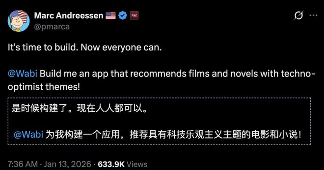 a16z创始人Marc则利用Wabi创建了一个技术乐观主义风格的电影和小说推荐系统。