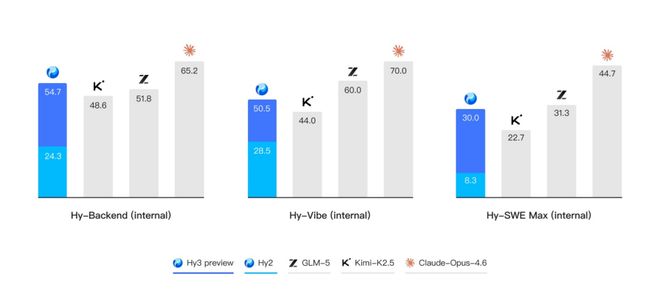 除了公开榜单,腾讯混元还进一步构建了多个内部的评测集,对模型在真实开发场景中的表现进行评估。结果表明,无论是在后端工程任务集 Hy-Backend,贴近真实用户开发交互的 Hy-Vibe Bench,还是高难度软件工程开发任务集 Hy-SWE Max 上,Hy3 preview 均体现出了强竞争力。