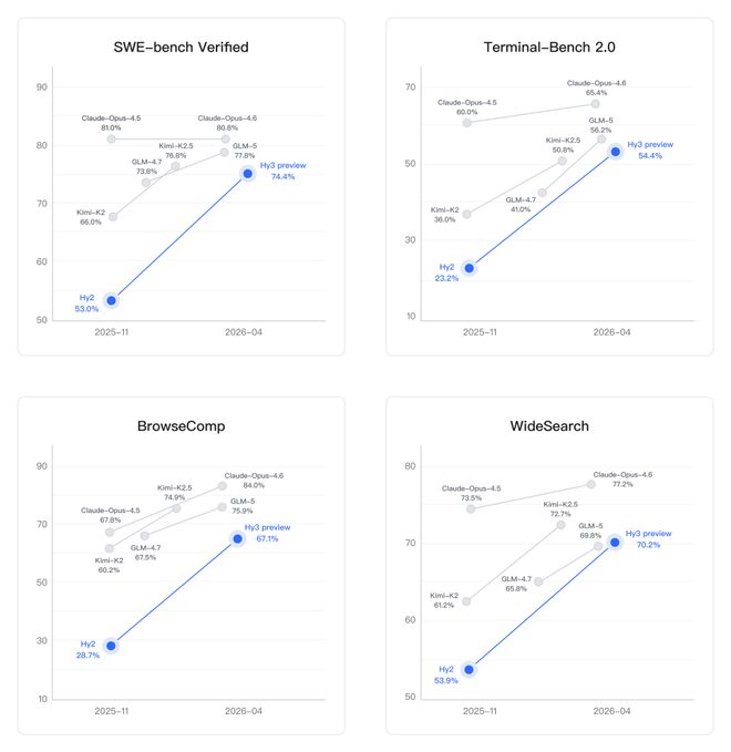 同时,Hy3 preview在ClawEval和WildClawBench等评测中表现突出,表明我们的智能体能力正在稳步走向全面与实用。