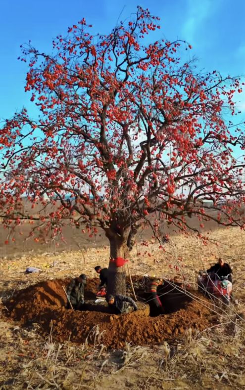 只有柿树还没醒来。秋冬剥去了叶片,裸露的枝干令它的身价更为直观。土壤松动,挖树的工时大大缩短。20℃左右的气温下,暴露根部蒸腾的水分还不致死。