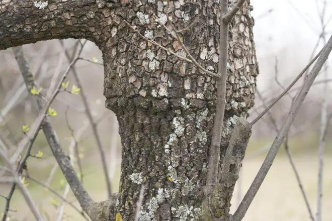 凑近了,才能看清它鳄鱼纹般皴裂的树皮,每颗鳞甲的厚度将近一指。从侧面看才能看出玄机——一共有七八层。李老汉说,柿树从指头粗的树苗,长成对把粗的幼树时,要用10年。也正是那时,它第一次绽裂树皮,此后每十年长一层。以此推测,这树已经快80岁了。