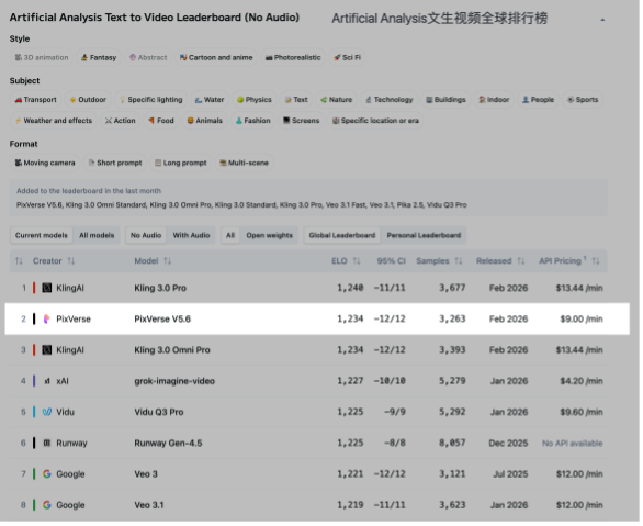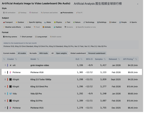 在完成新一轮融资的同时,爱诗科技的技术实力获得了国际权威机构的认可。截至2026年2月底,全球领先的AI评估机构Artificial Analysis发布的最新排名中,爱诗科技的PixVerse V5.6模型在图像转视频和文本转视频两个关键领域均位列第二。