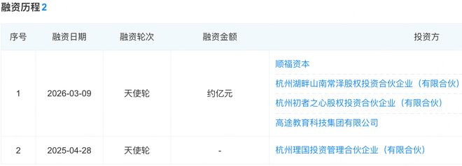 由企查查可知,该公司目前已完成两轮融资。2025年4月,其曾获得杭州理国投的天使轮融资;而后就是今年3月9日,其刚刚披露了来自湖畔山南、初心资本等机构的近亿元融资。