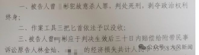 2023年1月21日,莆田中院一审判处曾某彬死刑,剥夺政治权利终身;赔偿林金灿及其家人经济损失5.5758万元。