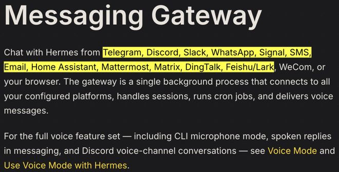 用户可以通过多种消息平台与其互动,并且有一个网关进程将所有入口连接在一起。