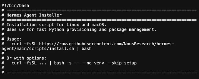 curl -fsSL https://raw.githubusercontent.com/NousResearch/hermes-agent/main/scripts/install.sh | bash