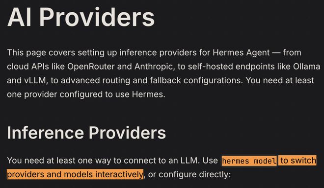 Nous Portal、OpenRouter、OpenAI、本地Ollama,都是常见选择。