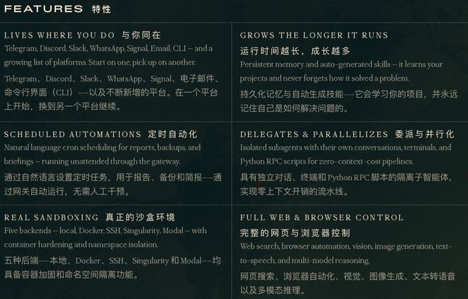 Hermes Agent还内置了批量轨迹生成和强化学习环境,使得日常操作记录可以直接用于训练下一代模型。