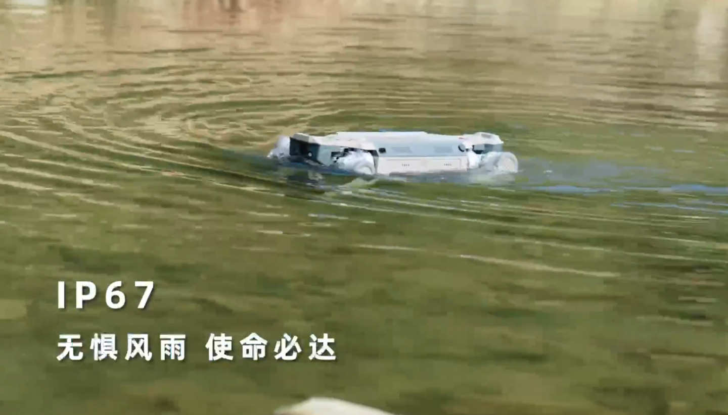 该款机器人具备30公里的续航能力,防水等级达到IP67标准,可承载30公斤的重量,最高速度为每秒8米,适用于安防、巡检、应急救援、消防和物流等多个领域。