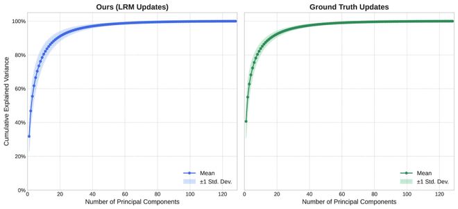 图 7:LRM 成功学习到真实的低维结构。(左图)LRM 预测的更新特征的 PCA 分析(右图)真实更新特征的PCA 分析。