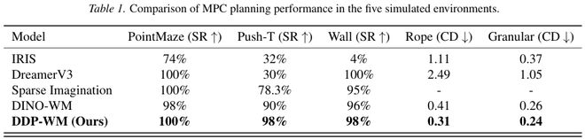 为了全面评估 DDP-WM 的有效性,研究团队在五个不同动态特性和任务复杂度的仿真环境中进行了广泛的实验。这些环境包括从简单的导航到复杂的刚体操作和柔性体运动等场景。主要评估指标为规划成功率、倒角距离及模型预测控制 (MPC) 的计算效率。