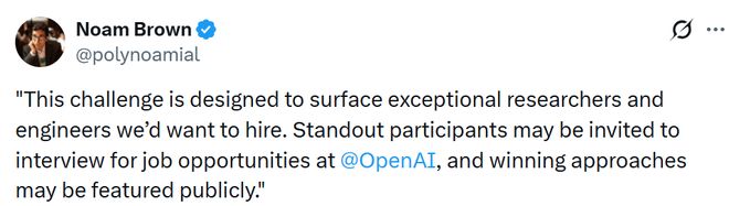 从更实际的角度来看,OpenAI 计划在今年 6 月招募早期研究人才,重点面向本科生和应届毕业生,包括各类竞赛选手。对于表现突出的人来说,这次挑战本身就可能成为一块敲门砖。