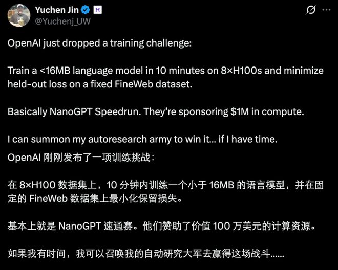 知名 AI 研究者 Yuchen Jin 也表示,这个比赛可以用 AI Agent 来完成,如果自己有时间,完全可以召唤自己的「自动研究大军」(AI Agent 集群)去打比赛。