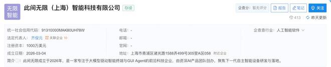 企查查资料显示,“此间无限”于2026年成立,注册资本1000万美元(约人民币6897.2万元),由今朝智华控股有限公司全资持有。该公司定位为一家致力于开发以大模型驱动的智能设备和GUI Agent的技术型企业。