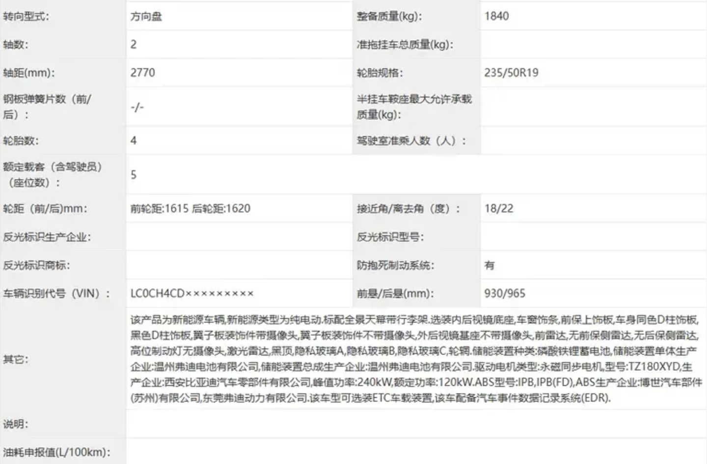 尺寸方面,该车型的长宽高分别为 4665mm、1895mm 和 1675mm,轴距为 2770mm。动力系统采用后置单电机布局,提供两种版本的最大功率输出,分别是 200kW 和 240kW,并且使用了比亚迪第二代刀片电池技术以及快速充电解决方案。