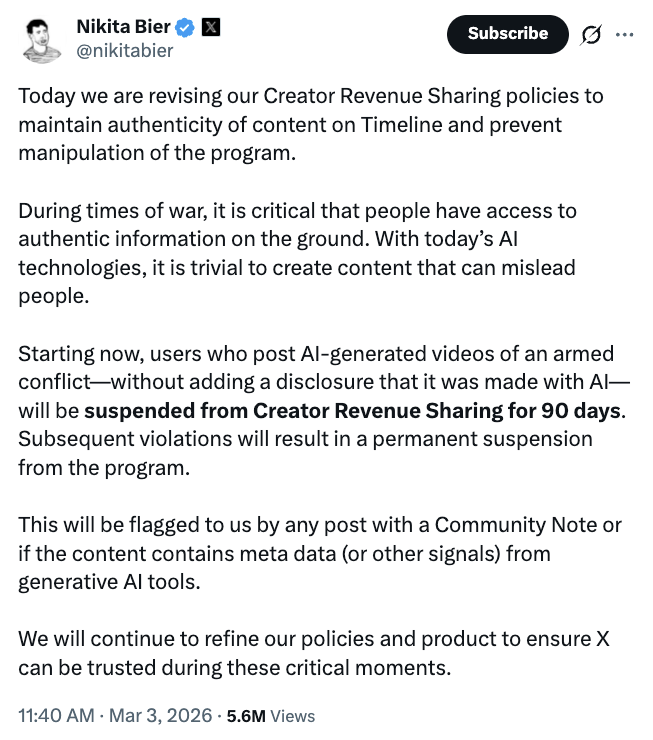 上个月,X的产品主管Nikita Bier宣布将采取更严格的反机器人检测和移除措施,并针对AI生成的内容引入用户标记机制,这是遏制自动垃圾信息和虚假消息的更广泛举措之一。